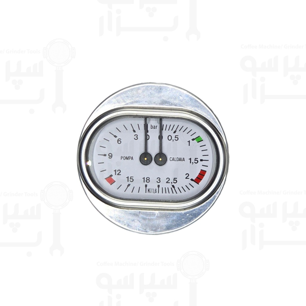 گیج منومتر / مانومتر دوعقربه دستگاه های گریمک و فیورنزاتو نشانگر فشار بخار 0 تا 3 بار فشار آب تا 18 بار قطربدنه 63 میلیمتر قطر قاب بیرونی 70 میلیمتر رزوه 1/8